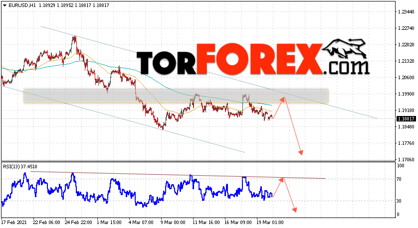 Таким образом, EUR/USD прогноз Евро Доллар на 23 марта 2021 предполагает развитие коррекции и тест области сопротивления вблизи уровня 1.1925. Откуда стоит ожидать отскок и попытку продолжения падения пары в область ниже уровня 1.1705. В пользу снижения валютной пары выступит тест линии тренда на индикаторе относительной силы. Отменой варианта падения пары EUR/USD станет сильный рост котировок и пробой уровня 1.2075. Это укажет на пробой области сопротивления и продолжение подъёма валютной пары на Форекс в область выше уровня 1.2305.