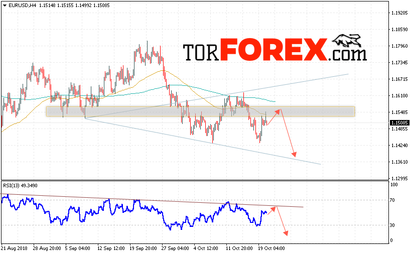 Таким образом, EUR/USD прогноз Евро Доллар на 23 октября 2018 предполагает попытку теста области сопротивления вблизи уровня 1.1545, откуда стоит ожидать отскок и попытку продолжения снижения пары в область ниже уровня 1.1365, в пользу падения выступит тест линии тренда на индикаторе относительной силы, отменой варианта падения EUR/USD станет сильный рост и пробой уровня 1.1625, что укажет на пробой сопротивления и продолжение роста пары в область выше уровня 1.1725.