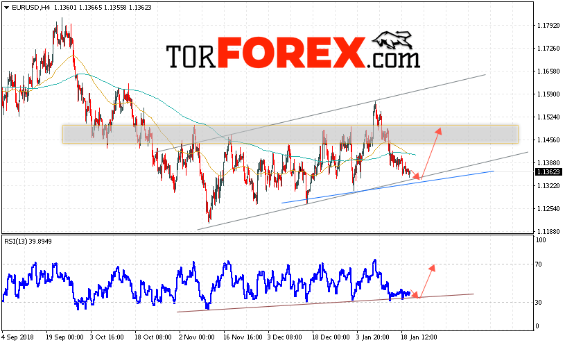 Таким образом, EUR/USD прогноз Евро Доллар на 23 января 2019 предполагает попытку теста области поддержки вблизи уровня 1.1335. Откуда стоит ожидать отскок и попытку продолжения роста пары в область выше уровня 1.1485. В пользу подъёма валютной пары выступит тест линии тренда на индикаторе относительной силы. Отменой варианта роста EUR/USD станет падение и пробой уровня 1.1285. Это укажет на пробой нижней границы канала и продолжение падения пары в область ниже уровня 1.1200.