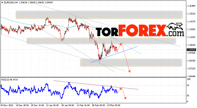 Таким образом, EUR/USD прогноз Евро Доллар на 24 марта 2022 предполагает попытку продолжения развития бычьей коррекции и тест области сопротивления вблизи уровня 1.1075. Откуда стоит рассматривать отскок цены вниз и попытку продолжения падения валютной пары на рынке в область ниже уровня 1.0695. В пользу снижения инструмента на рынке Форекс выступит тест нисходящей линии тренда на индикаторе относительной силы (RSI). Отменой варианта падения пары EUR/USD станет сильный рост котировок и пробой уровня 1.1225. Это укажет на пробой области сопротивления и продолжение подъёма валютной пары на Форекс в область выше уровня 1.1475.