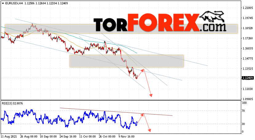 Таким образом, EUR/USD прогноз Евро Доллар на 24 ноября 2021 предполагает развитие бычьей коррекции и тест области сопротивления вблизи уровня 1.1305. Откуда стоит рассматривать отскок цен вниз и попытку продолжения падения валютной пары на рынке в область ниже уровня 1.0985. В пользу снижения инструмента на рынке Форекс выступит тест нисходящей линии тренда на индикаторе относительной силы (RSI). Отменой варианта падения пары EUR/USD станет сильный рост котировок и пробой уровня 1.1375. Это укажет на пробой области сопротивления и продолжение подъёма валютной пары на Форекс в область выше уровня 1.1545.