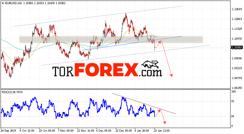 Таким образом, EUR/USD прогноз Евро Доллар на 24 января 2020 предполагает развитие коррекции и тест области сопротивления вблизи уровня 1.1085. Откуда стоит ожидать отскок и попытку продолжения падения пары в область ниже уровня 1.0865. В пользу снижения валютной пары выступит тест линии тренда на индикаторе относительной силы. Отменой варианта падения EUR/USD станет сильный рост и пробой уровня 1.1205. Это укажет на пробой сопротивления и продолжение роста пары в область выше уровня 1.1415.