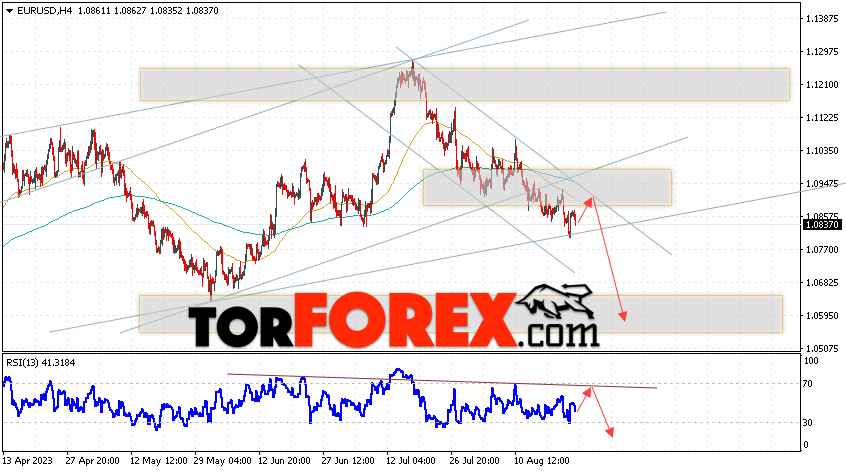 Таким образом, EUR/USD прогноз Евро Доллар на 25 августа 2023 предполагает попытку развития подъёма пары и тест области сопротивления вблизи уровня 1.0870. Откуда стоит рассматривать отскок цены вниз и попытку продолжения падения валютной пары на рынке в область ниже уровня 1.0595. Дополнительным сигналом в пользу падения инструмента на рынке Форекс выступит тест линии тренда на индикаторе относительной силы (RSI). Отменой варианта со снижением пары EUR/USD станет сильный рост котировок и пробой уровня 1.1025. Это укажет на пробой области сопротивления и продолжение роста валютной пары на Форекс в область выше уровня 1.1265.