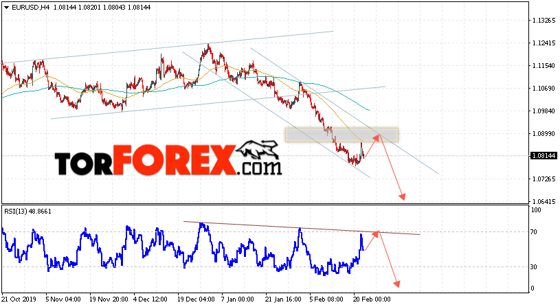 Дополнительным сигналом в пользу падения котировок EUR/USD выступит тест линии сопротивления на индикаторе относительной силы (RSI). Вторым сигналом станет отскок от верхней границы нисходящего канала. Отменой варианта снижения котировок валютной пары Евро Доллар станет сильный рост и пробой уровня 1.0955. Это укажет на пробой области сопротивления и продолжение роста в область на уровне 1.1105. Ожидать ускорения падения по паре EUR/USD стоит с пробоем области поддержки и закрытием ниже уровня 1.0725.