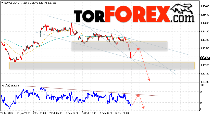 Таким образом, EUR/USD прогноз Евро Доллар на 25 февраля 2022 предполагает попытку продолжения развития бычьей коррекции и тест области сопротивления вблизи уровня 1.1245. Откуда стоит рассматривать отскок цены вниз и попытку продолжения падения валютной пары на рынке в область ниже уровня 1.0935. В пользу снижения инструмента на рынке Форекс выступит тест нисходящей линии тренда на индикаторе относительной силы (RSI). Отменой варианта падения пары EUR/USD станет сильный рост котировок и пробой уровня 1.1365. Это укажет на пробой области сопротивления и продолжение подъёма валютной пары на Форекс в область выше уровня 1.1575.