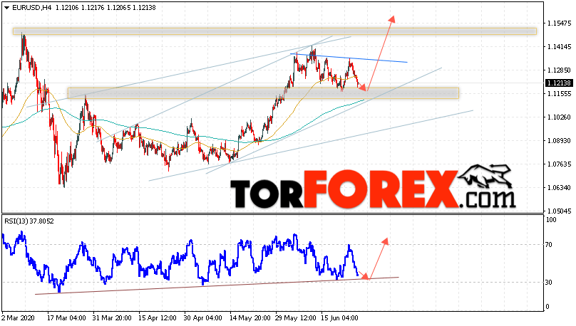 Таким образом, EUR/USD прогноз Евро Доллар на 26 июня 2020 предполагает развитие коррекции и тест области поддержки вблизи уровня 1.1185. Откуда стоит ожидать отскок и попытку продолжения роста пары в область выше уровня 1.1545. В пользу подъёма валютной пары выступит тест линии тренда на индикаторе относительной силы. Отменой варианта роста EUR/USD станет падение и пробой уровня 1.1115. Это укажет на пробой поддержки и продолжение падения валютной пары на Форекс в область ниже уровня 1.0835.
