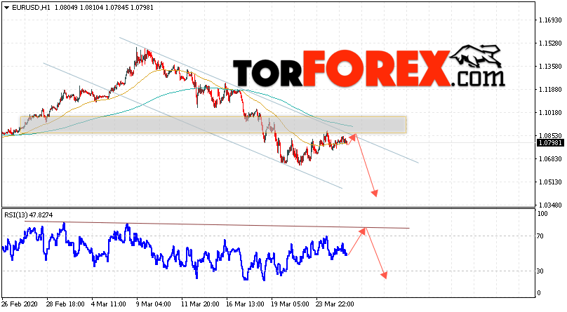Таким образом, EUR/USD прогноз Евро Доллар на 26 марта 2020 предполагает развитие коррекции и тест области сопротивления вблизи уровня 1.0850. Откуда стоит ожидать отскок и попытку продолжения падения пары в область ниже уровня 1.0465. В пользу снижения валютной пары выступит тест линии тренда на индикаторе относительной силы. Отменой варианта падения EUR/USD станет сильный рост и пробой уровня 1.1025. Это укажет на пробой сопротивления и продолжение роста пары в область выше уровня 1.1285.