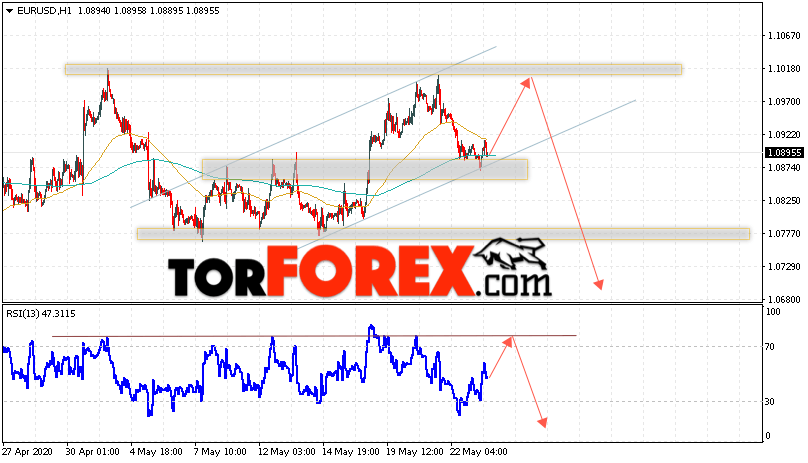 Таким образом, EUR/USD прогноз Евро Доллар на 26 мая 2020 предполагает развитие коррекции и тест области сопротивления вблизи уровня 1.0975. Откуда стоит ожидать отскок и попытку продолжения падения пары в область ниже уровня 1.0685. В пользу снижения валютной пары выступит тест линии тренда на индикаторе относительной силы. Отменой варианта падения EUR/USD станет сильный рост и пробой уровня 1.1065. Это укажет на пробой сопротивления и продолжение подъёма валютной пары на Форекс в область выше уровня 1.1245.