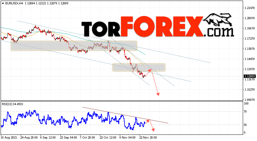 Таким образом, EUR/USD прогноз Евро Доллар на 26 ноября 2021 предполагает развитие бычьей коррекции и тест области сопротивления вблизи уровня 1.1285. Откуда стоит рассматривать отскок цен вниз и попытку продолжения падения валютной пары на рынке в область ниже уровня 1.0855. В пользу снижения инструмента на рынке Форекс выступит тест нисходящей линии тренда на индикаторе относительной силы (RSI). Отменой варианта падения пары EUR/USD станет сильный рост котировок и пробой уровня 1.1355. Это укажет на пробой области сопротивления и продолжение подъёма валютной пары на Форекс в область выше уровня 1.1545.