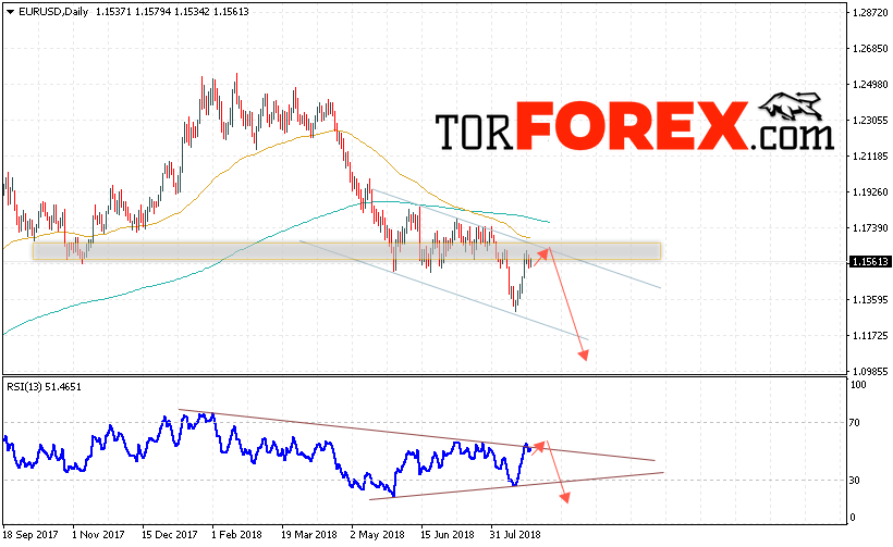 Таким образом, EUR/USD прогноз Евро Доллар на 27 — 31 августа 2018 предполагает попытку теста верней границы нисходящего канала вблизи уровня 1.1580, откуда стоит ожидать начала падения пары в область ниже уровня 1.0950, в пользу снижения выступит тест линии тренда на индикаторе относительной силы, отменой варианта падения евро доллар станет сильный рост и пробой уровня 1.1680, в этом случае стоит ожидать продолжения роста пары с потенциальной целью на уровне 1.1950.
