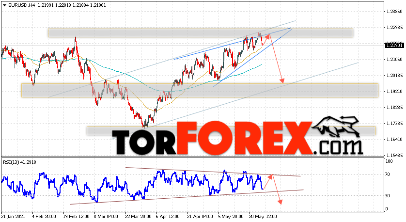 Таким образом, EUR/USD прогноз Евро Доллар на 27 мая 2021 предполагает развитие коррекции и тест области сопротивления вблизи уровня 1.2245. Откуда стоит ожидать отскок и попытку продолжения падения пары в область ниже уровня 1.1925. В пользу падения валютной пары выступит тест линии тренда на индикаторе относительной силы. Отменой варианта снижения пары EUR/USD станет сильный рост котировок и пробой уровня 1.2325. Это укажет на пробой области сопротивления и продолжение подъёма валютной пары на Форекс в область выше уровня 1.2575.