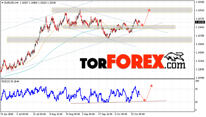 Таким образом, EUR/USD прогноз Евро Доллар на 27 октября 2020 предполагает развитие коррекции и тест области поддержки вблизи уровня 1.1775. Откуда стоит ожидать отскок и попытку продолжения роста пары в область выше уровня 1.1995. В пользу подъёма валютной пары выступит тест линии тренда на индикаторе относительной силы. Отменой варианта роста EUR/USD станет падение и пробой уровня 1.1705. Это укажет на пробой поддержки и продолжение падения валютной пары на Форекс в область ниже уровня 1.1445.