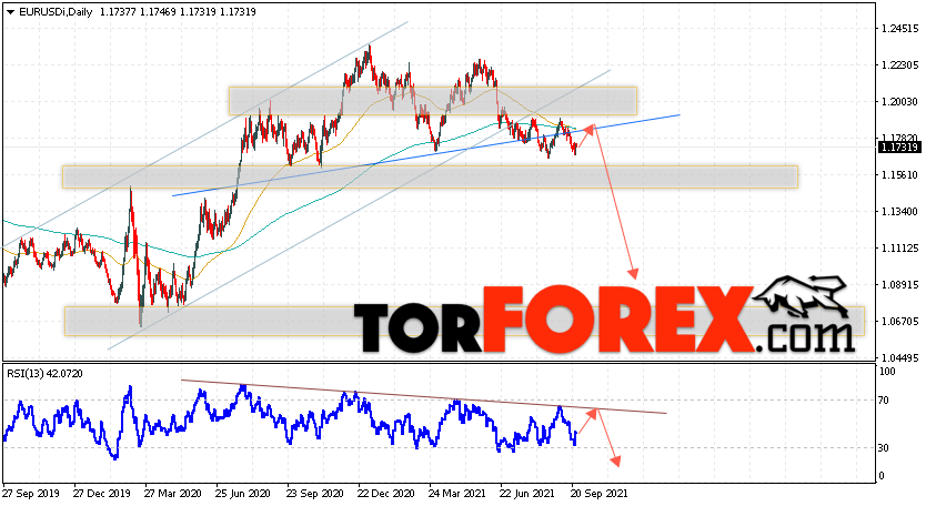 Дополнительным сигналом в пользу падения валютной пары EUR/USD на Форекс выступит тест нисходящей линии тренда на индикаторе относительной силы, как видим, уже было несколько отскоков от данной линии. Вторым сигналом станет отскок от линии ”Шеи” разворотной модели ”Голова и плечи”. Отменой варианта снижения котировок пары Евро Доллар на текущей торговой неделе 27 сентября — 1 октября 2021, станет сильный рост и пробой уровня 1.2275. Это укажет на пробой области сопротивления и продолжение роста пары в область выше уровня 1.2695. С пробоем области поддержки и закрытием котировок ниже уровня 1.1515, пока же эту область пробить не удается.