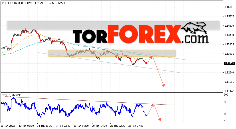 Таким образом, EUR/USD прогноз Евро Доллар на 27 января 2022 предполагает развитие небольшой бычьей коррекции и тест области сопротивления вблизи уровня 1.1315. Откуда стоит рассматривать отскок цены вниз и попытку продолжения падения валютной пары на рынке в область ниже уровня 1.1135. В пользу снижения инструмента на рынке Форекс выступит тест нисходящей линии тренда на индикаторе относительной силы (RSI). Отменой варианта падения пары EUR/USD станет сильный рост котировок и пробой уровня 1.1375. Это укажет на пробой области сопротивления и продолжение подъёма валютной пары на Форекс в область выше уровня 1.1485.