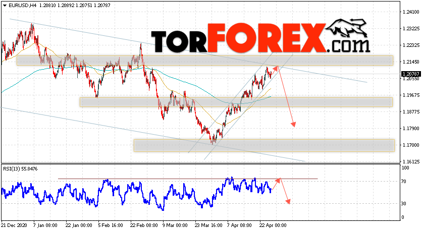 Таким образом, EUR/USD прогноз Евро Доллар на 28 апреля 2021 предполагает развитие коррекции и тест области сопротивления вблизи уровня 1.2120. Откуда стоит ожидать отскок и попытку продолжения падения пары в область ниже уровня 1.1785. В пользу падения валютной пары выступит тест линии тренда на индикаторе относительной силы. Отменой варианта снижения пары EUR/USD станет сильный рост котировок и пробой уровня 1.2185. Это укажет на пробой области сопротивления и продолжение подъёма валютной пары на Форекс в область выше уровня 1.2305.