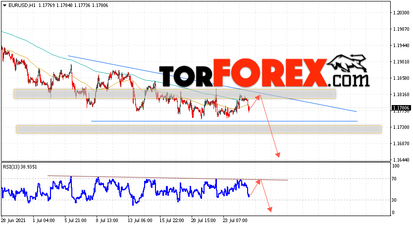 Таким образом, EUR/USD прогноз Евро Доллар на 28 июля 2021 предполагает развитие коррекции и тест области сопротивления вблизи уровня 1.1825. Откуда стоит ожидать отскок и попытку продолжения падения пары в область ниже уровня 1.1665. В пользу падения валютной пары выступит тест линии тренда на индикаторе относительной силы. Отменой варианта снижения пары EUR/USD станет сильный рост котировок и пробой уровня 1.1875. Это укажет на пробой области сопротивления и продолжение подъёма валютной пары на Форекс в область выше уровня 1.2265.