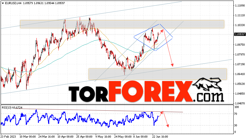 Таким образом, EUR/USD прогноз Евро Доллар на 28 июня 2023 предполагает попытку развития бычьей коррекции пары и тест области сопротивления вблизи уровня 1.0975. Откуда стоит рассматривать отскок цены вниз и попытку падения валютной пары на рынке в область ниже уровня 1.0695. Дополнительным сигналом в пользу снижения инструмента на рынке Форекс выступит тест линии тренда на индикаторе относительной силы (RSI). Отменой варианта с падением пары EUR/USD станет сильный рост котировок и пробой уровня 1.1085. Это укажет на пробой области сопротивления и продолжение роста валютной пары на Форекс в область выше уровня 1.1315.
