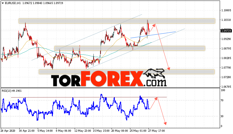 Таким образом, EUR/USD прогноз Евро Доллар на 28 мая 2020 предполагает развитие коррекции и тест области сопротивления вблизи уровня 1.1005. Откуда стоит ожидать отскок и попытку продолжения падения пары в область ниже уровня 1.0765. В пользу снижения валютной пары выступит тест линии тренда на индикаторе относительной силы. Отменой варианта падения EUR/USD станет сильный рост и пробой уровня 1.1075. Это укажет на пробой сопротивления и продолжение подъёма валютной пары на Форекс в область выше уровня 1.1305.