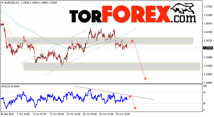 Таким образом, EUR/USD прогноз Евро Доллар на 28 октября 2021 предполагает развитие коррекции и тест области сопротивления вблизи уровня 1.1625. Откуда стоит ожидать отскок и попытку падения падения пары в область ниже уровня 1.1455. В пользу снижения валютной пары выступит тест линии тренда на индикаторе относительной силы (RSI). Отменой варианта падения пары EUR/USD станет сильный рост котировок и пробой уровня 1.1705. Это укажет на пробой области сопротивления и продолжение подъёма валютной пары на Форекс в область выше уровня 1.1965.
