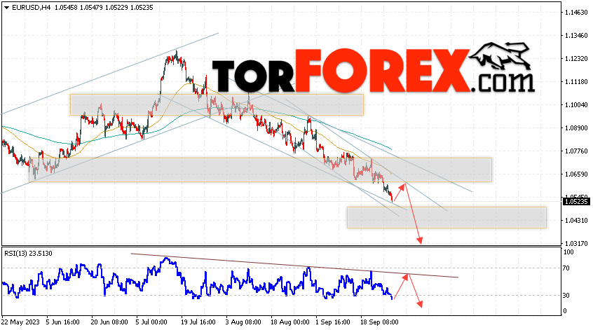 Таким образом, EUR/USD прогноз Евро Доллар на 28 сентября 2023 предполагает попытку развития бычьей коррекции пары и тест области сопротивления вблизи уровня 1.0565. Откуда стоит рассматривать отскок цены вниз и попытку продолжения падения валютной пары на рынке в область ниже уровня 1.0315. Дополнительным сигналом в пользу падения инструмента на рынке Форекс выступит тест линии тренда на индикаторе относительной силы (RSI). Отменой варианта со снижением пары EUR/USD станет сильный рост котировок и пробой уровня 1.0675. Это укажет на пробой области сопротивления и продолжение роста валютной пары на Форекс в область выше уровня 1.0925.