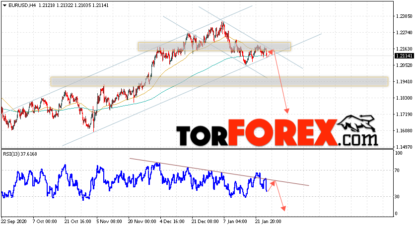 Таким образом, EUR/USD прогноз Евро Доллар на 28 января 2021 предполагает развитие коррекции и тест области сопротивления вблизи уровня 1.2145. Откуда стоит ожидать отскок и попытку продолжения падения пары в область ниже уровня 1.1725. В пользу снижения валютной пары выступит тест линии тренда на индикаторе относительной силы. Отменой варианта падения пары EUR/USD станет сильный рост котировок и пробой уровня 1.2245. Это укажет на пробой области сопротивления и продолжение подъёма валютной пары на Форекс в область выше уровня 1.2375.