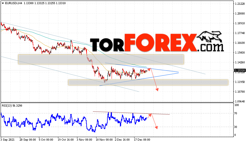 Таким образом, EUR/USD прогноз Евро Доллар на 29 декабря 2021 предполагает развитие бычьей коррекции и тест области сопротивления вблизи уровня 1.1345. Откуда стоит рассматривать отскок цены вниз и попытку продолжения падения валютной пары на рынке в область ниже уровня 1.1075. В пользу снижения инструмента на рынке Форекс выступит тест нисходящей линии тренда на индикаторе относительной силы (RSI). Отменой варианта падения пары EUR/USD станет сильный рост котировок и пробой уровня 1.1445. Это укажет на пробой области сопротивления и продолжение подъёма валютной пары на Форекс в область выше уровня 1.1645.