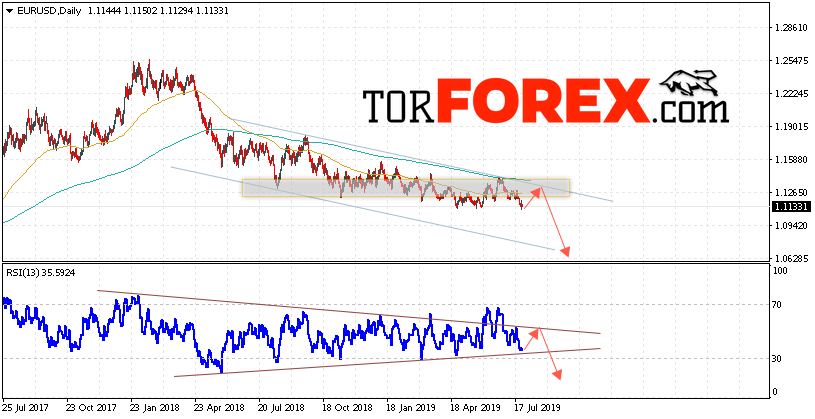 Таким образом, EUR/USD прогноз Евро Доллар на 29 июля — 2 августа 2019 предполагает попытку теста области сопротивления вблизи уровня 1.1265. Откуда стоит ожидать продолжения падения пары в область ниже уровня 1.0625. В пользу падения выступит тест линии тренда на индикаторе относительной силы. Отменой варианта снижения евро доллар станет сильный рост и пробой уровня 1.1465. В этом случае стоит ожидать продолжения роста пары с потенциальной целью на уровне 1.1865.