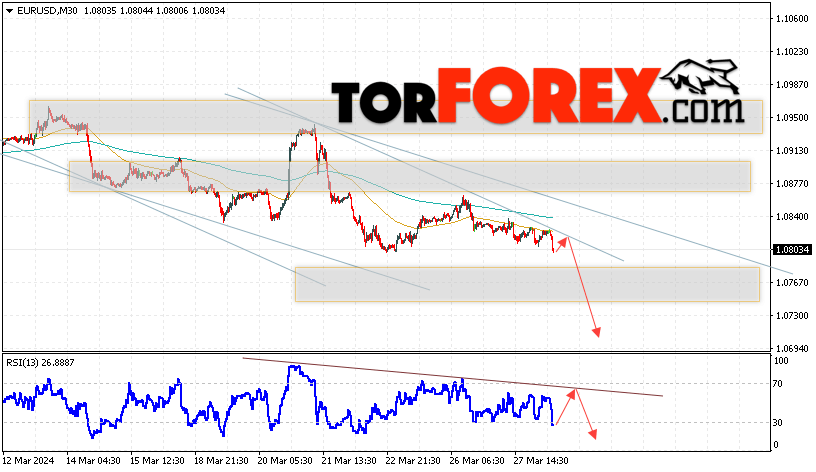 Валютная пара Евро Доллар EUR/USD продолжает движение в рамках развития падения и медвежьего канала. Скользящие средние указывают на наличие краткосрочной медвежьего тенденции по паре. Цены пробили область между сигнальными линиями вниз, что указывает на давление со стороны продавцов европейской валюты и потенциальное продолжение падения котировок пары актива уже с текущих уровней. В момент публикации прогноза курс Евро к Доллару США составляет 1.0831. В рамках Форекс прогноза на 29 марта 2024 стоит ожидать попытку развития бычьей коррекции цены и тест уровня сопротивления, который располагается на паре EUR/USD вблизи области 1.0835. Далее, отскок цен вниз и продолжение падения валютной пары Евро Доллар. Потенциальной целью такого движения на FOREX выступает область ниже уровня 1.0695.