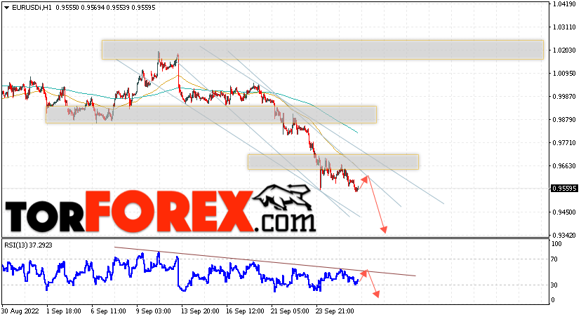 Валютная пара Евро Доллар EUR/USD продолжает движение в рамках падения и нисходящего канала. Скользящие средние указывают на наличие краткосрочной медвежьей тенденции по паре. Цены пробили область между сигнальными линиями вниз, что указывает на давление со стороны продавцов европейской валюты и потенциальное продолжение падения котировок актива уже с текущих уровней. В момент публикации прогноза курс Евро к Доллару США составляет 0.9559. В рамках Форекс прогноза на 29 сентября 2022 стоит ожидать попытку развития незначительного подъёма цены и тест уровня сопротивления, который располагается на паре вблизи области 0.9635. Далее, отскок вниз и продолжения падения валютной пары Евро Доллар. Потенциальной целью такого движения на FOREX выступает область ниже уровня 0.9345.