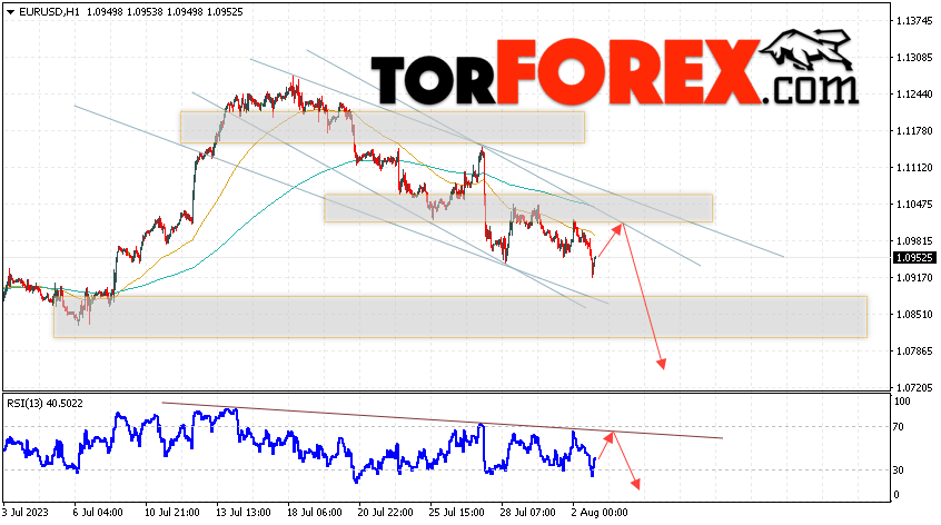Таким образом, EUR/USD прогноз Евро Доллар на 3 августа 2023 предполагает попытку развития подъёма пары и тест области сопротивления вблизи уровня 1.0985. Откуда стоит рассматривать отскок цены вниз и попытку продолжения падения валютной пары на рынке в область ниже уровня 1.0765. Дополнительным сигналом в пользу падения инструмента на рынке Форекс выступит тест линии тренда на индикаторе относительной силы (RSI). Отменой варианта со снижением пары EUR/USD станет сильный рост котировок и пробой уровня 1.1065. Это укажет на пробой области сопротивления и продолжение роста валютной пары на Форекс в область выше уровня 1.1285.