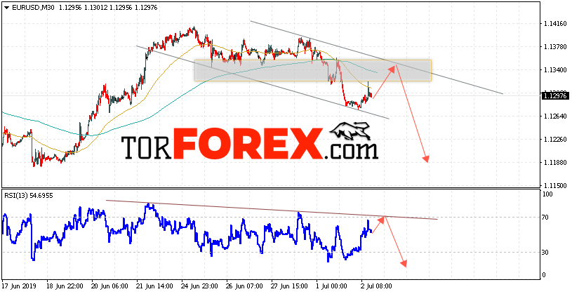 Таким образом, EUR/USD прогноз Евро Доллар на 3 июля 2019 предполагает попытку теста области сопротивления вблизи уровня 1.1345. Откуда стоит ожидать отскок и попытку продолжения снижения пары в область ниже уровня 1.1180. В пользу снижения валютной пары выступит тест линии сопротивления на индикаторе относительной силы. Отменой варианта снижения EUR/USD станет сильный рост и пробой уровня 1.1390. Это укажет на пробой области сопротивления и продолжение роста пары в область выше уровня 1.1485.