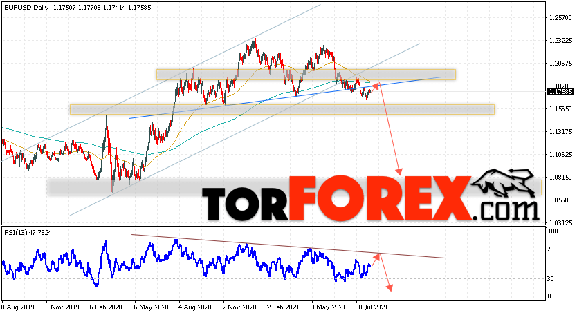 Дополнительным сигналом в пользу падения валютной пары EUR/USD на Форекс выступит тест нисходящей линии тренда на индикаторе относительной силы, как видим, уже было несколько отскоков от данной линии. Вторым сигналом станет отскок от линии ”Шеи” разворотной модели ”Голова и плечи”. Отменой варианта снижения котировок пары Евро Доллар на текущей торговой неделе 30 августа — 3 сентября 2021, станет сильный рост и пробой уровня 1.2265. Это укажет на пробой области сопротивления и продолжение роста пары в область выше уровня 1.2655. С пробоем области поддержки и закрытием котировок ниже уровня 1.1525.