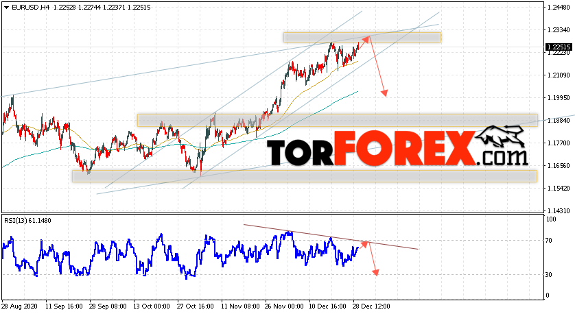 Таким образом, EUR/USD прогноз Евро Доллар на 30 декабря 2020 предполагает развитие коррекции и тест области сопротивления вблизи уровня 1.2265. Откуда стоит ожидать отскок и попытку продолжения падения пары в область ниже уровня 1.1995. В пользу снижения валютной пары выступит тест линии тренда на индикаторе относительной силы. Отменой варианта падения пары EUR/USD станет сильный рост котировок и пробой уровня 1.2335. Это укажет на пробой области сопротивления и продолжение роста валютной пары на Форекс в область выше уровня 1.2545.