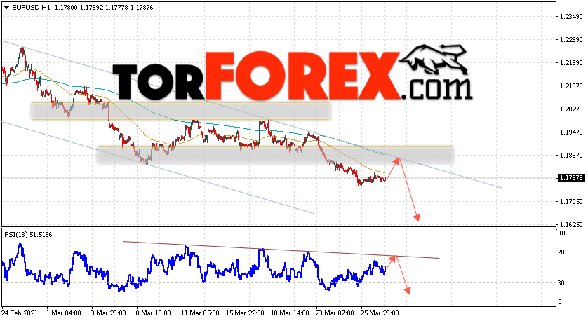 Таким образом, EUR/USD прогноз Евро Доллар на 30 марта 2021 предполагает развитие коррекции и тест области сопротивления вблизи уровня 1.1835. Откуда стоит ожидать отскок и попытку продолжения падения пары в область ниже уровня 1.1625. В пользу снижения валютной пары выступит тест линии тренда на индикаторе относительной силы. Отменой варианта падения пары EUR/USD станет сильный рост котировок и пробой уровня 1.1935. Это укажет на пробой области сопротивления и продолжение подъёма валютной пары на Форекс в область выше уровня 1.2265.