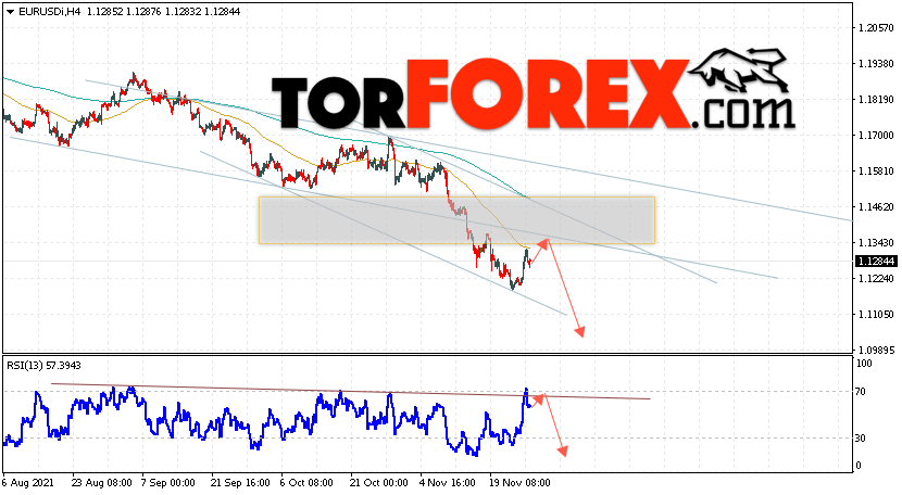 Таким образом, EUR/USD прогноз Евро Доллар на 30 ноября 2021 предполагает развитие бычьей коррекции и тест области сопротивления вблизи уровня 1.1335. Откуда стоит рассматривать отскок цен вниз и попытку продолжения падения валютной пары на рынке в область ниже уровня 1.0995. В пользу снижения инструмента на рынке Форекс выступит тест нисходящей линии тренда на индикаторе относительной силы (RSI). Отменой варианта падения пары EUR/USD станет сильный рост котировок и пробой уровня 1.1355. Это укажет на пробой области сопротивления и продолжение подъёма валютной пары на Форекс в область выше уровня 1.1565.