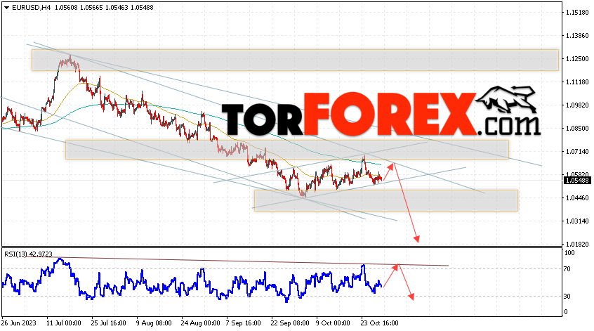 Таким образом, EUR/USD прогноз Евро Доллар на 31 октября 2023 предполагает попытку развития бычьей коррекции пары и тест области сопротивления вблизи уровня 1.0595. Откуда стоит рассматривать отскок цены вниз и попытку продолжения падения валютной пары на рынке в область ниже уровня 1.0185. Дополнительным сигналом в пользу падения инструмента на рынке Форекс выступит тест линии тренда на индикаторе относительной силы (RSI). Отменой варианта со снижением пары EUR/USD станет сильный рост котировок и пробой уровня 1.0735. Это укажет на пробой области сопротивления и продолжение роста валютной пары на Форекс в область выше уровня 1.0875.