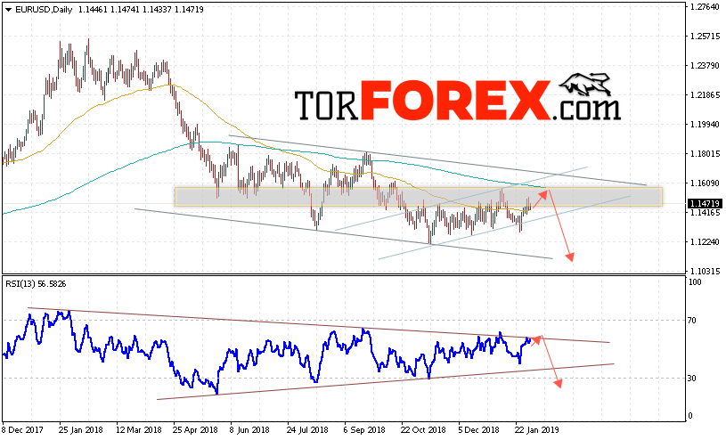 Таким образом, EUR/USD прогноз Евро Доллар на 4 — 8 февраля 2019 предполагает попытку теста области сопротивления вблизи уровня 1.1555. Откуда стоит ожидать продолжения падения пары в область ниже уровня 1.1045. В пользу падения выступит тест линии тренда на индикаторе относительной силы. Отменой варианта снижения евро доллар станет сильный рост и пробой уровня 1.1705. В этом случае стоит ожидать продолжения роста пары с потенциальной целью на уровне 1.2050.