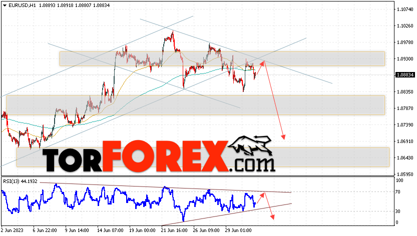 Таким образом, EUR/USD прогноз Евро Доллар на 4 июля 2023 предполагает попытку развития бычьей коррекции пары и тест области сопротивления вблизи уровня 1.0920. Откуда стоит рассматривать отскок цены вниз и попытку падения валютной пары на рынке в область ниже уровня 1.0685. Дополнительным сигналом в пользу снижения инструмента на рынке Форекс выступит тест линии тренда на индикаторе относительной силы (RSI). Отменой варианта с падением пары EUR/USD станет сильный рост котировок и пробой уровня 1.1015. Это укажет на пробой области сопротивления и продолжение роста валютной пары на Форекс в область выше уровня 1.1285.