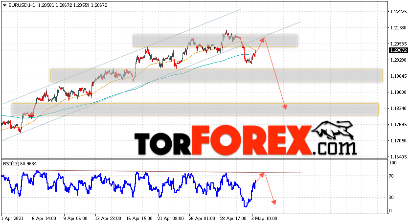 Таким образом, EUR/USD прогноз Евро Доллар на 4 мая 2021 предполагает развитие коррекции и тест области сопротивления вблизи уровня 1.2115. Откуда стоит ожидать отскок и попытку продолжения падения пары в область ниже уровня 1.1835. В пользу падения валютной пары выступит тест линии тренда на индикаторе относительной силы. Отменой варианта снижения пары EUR/USD станет сильный рост котировок и пробой уровня 1.2175. Это укажет на пробой области сопротивления и продолжение подъёма валютной пары на Форекс в область выше уровня 1.2345.