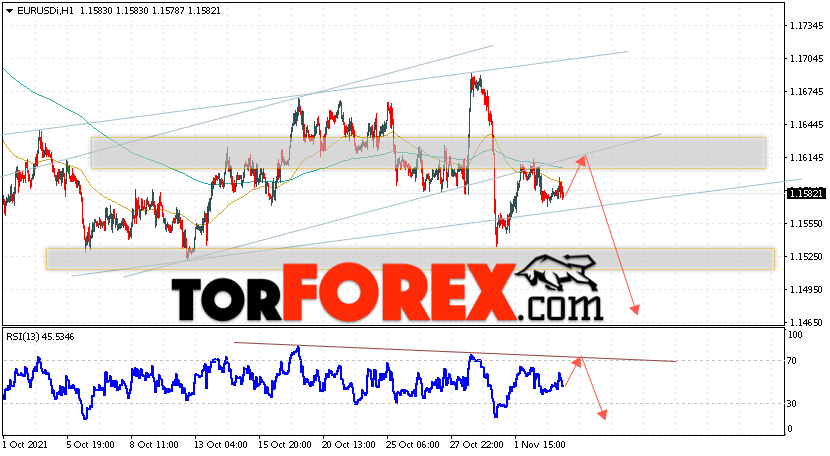 Валютная пара Евро Доллар EUR/USD продолжает движение в рамках падения и бычьего канала. Скользящие средние указывают на наличие краткосрочной медвежьей тенденции по паре. Цены пробили область между сигнальными линиями вниз, что указывает на давление со стороны продавцов европейской валюты и потенциальное продолжение падения котировок актива уже с текущих уровней. В момент публикации прогноза курс Евро к Доллару США составляет 1.1582. В рамках Форекс прогноза на 4 ноября 2021 стоит ожидать попытку продолжения развития бычьей коррекции цены и тест уровня сопротивления, который располагается на паре вблизи области 1.1615. Далее, отскок вниз и продолжения падения валютной пары Евро Доллар. Потенциальной целью такого движения на FOREX выступает область ниже уровня 1.1465.