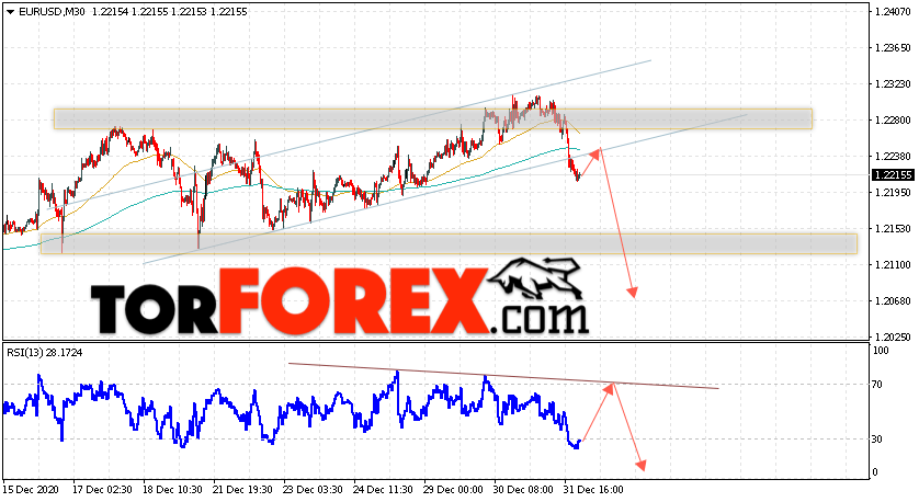 Таким образом, EUR/USD прогноз Евро Доллар на 4 января 2021 предполагает развитие коррекции и тест области сопротивления вблизи уровня 1.2245. Откуда стоит ожидать отскок и попытку продолжения падения пары в область ниже уровня 1.2065. В пользу снижения валютной пары выступит тест линии тренда на индикаторе относительной силы. Отменой варианта падения пары EUR/USD станет сильный рост котировок и пробой уровня 1.2325. Это укажет на пробой области сопротивления и продолжение подъёма валютной пары на Форекс в область выше уровня 1.2455.