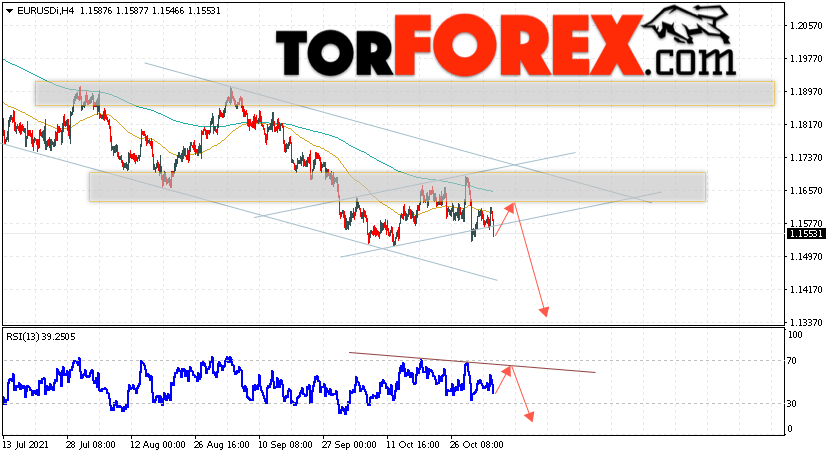 Таким образом, EUR/USD прогноз Евро Доллар на 5 ноября 2021 предполагает развитие коррекции и тест области сопротивления вблизи уровня 1.1575. Откуда стоит ожидать отскок и попытку падения падения валютной пары в область ниже уровня 1.1335. В пользу снижения валютной пары выступит тест линии тренда на индикаторе относительной силы (RSI). Отменой варианта падения пары EUR/USD станет сильный рост котировок и пробой уровня 1.1755. Это укажет на пробой области сопротивления и продолжение подъёма валютной пары на Форекс в область выше уровня 1.1965.