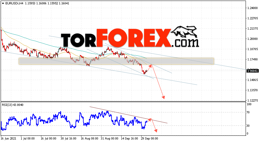 Валютная пара Евро Доллар EUR/USD продолжает движение в рамках коррекции и нисходящего канала. Скользящие средние указывают на наличие краткосрочной медвежьей тенденции по паре. Цены пробили область между сигнальными линиями вниз, что указывает на давление со стороны продавцов европейской валюты и потенциальное продолжение падения котировок актива уже с текущих уровней. В момент публикации прогноза курс Евро к Доллару США составляет 1.1604. В рамках Форекс прогноза на 5 октября 2021 стоит ожидать попытку развития коррекции цены и тест уровня сопротивления, который располагается на паре вблизи области 1.1625. Далее, отскок вниз и продолжения падения валютной пары Евро Доллар. Потенциальной целью такого движения на FOREX выступает область ниже уровня 1.1245.