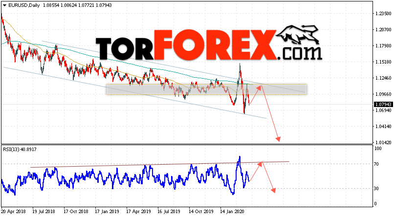 В пользу падения валютной пары EUR/USD на Форекс выступит тест линии сопротивления на индикаторе относительной силы. Вторым сигналом станет отскок от верхней границы нисходящего канала. Отменой варианта падения котировок пары Евро Доллар на текущей торговой неделе 6 — 10 апреля 2020, станет сильный рост и пробой уровня 1.1305. Это укажет на пробой области сопротивления и продолжения роста пары в область выше уровня 1.1675. С пробоем области поддержки и закрытием котировок ниже уровня 1.0465 стоит ожидать подтверждения развития медвежьего движения по паре.