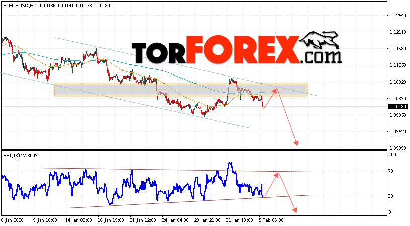 Таким образом, EUR/USD прогноз Евро Доллар на 6 февраля 2020 предполагает развитие коррекции и тест области сопротивления вблизи уровня 1.1045. Откуда стоит ожидать отскок и попытку продолжения падения пары в область ниже уровня 1.0905. В пользу снижения валютной пары выступит тест линии тренда на индикаторе относительной силы. Отменой варианта падения EUR/USD станет сильный рост и пробой уровня 1.1120. Это укажет на пробой сопротивления и продолжение роста пары в область выше уровня 1.1245.