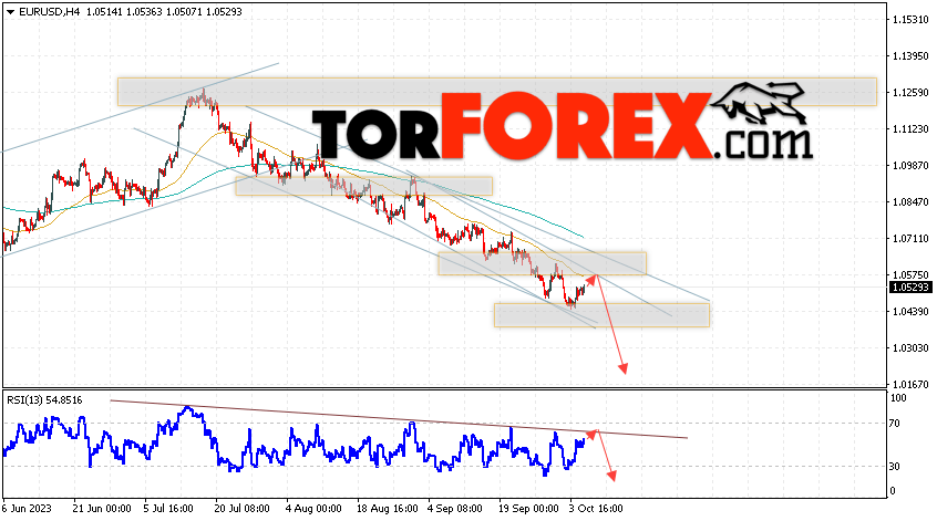 Таким образом, EUR/USD прогноз Евро Доллар на 6 октября 2023 предполагает попытку развития бычьей коррекции пары и тест области сопротивления вблизи уровня 1.0545. Откуда стоит рассматривать отскок цены вниз и попытку продолжения падения валютной пары на рынке в область ниже уровня 1.0275. Дополнительным сигналом в пользу падения инструмента на рынке Форекс выступит тест линии тренда на индикаторе относительной силы (RSI). Отменой варианта со снижением пары EUR/USD станет сильный рост котировок и пробой уровня 1.0615. Это укажет на пробой области сопротивления и продолжение роста валютной пары на Форекс в область выше уровня 1.0765.