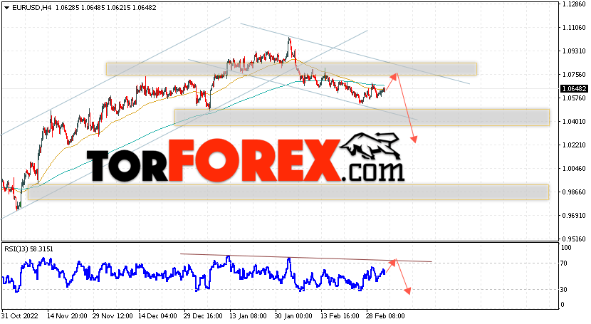 Таким образом, EUR/USD прогноз Евро Доллар на 7 марта 2023 предполагает попытку развития коррекции пары и тест области сопротивления вблизи уровня 1.0745. Откуда стоит рассматривать отскок цены вниз и попытку продолжения падения валютной пары на рынке в область ниже уровня 1.0225. В пользу снижения инструмента на рынке Форекс выступит тест линии тренда на индикаторе относительной силы (RSI). Отменой варианта падения пары EUR/USD станет сильный рост котировок и пробой уровня 1.0865. Это укажет на пробой области сопротивления и продолжение подъёма валютной пары на Форекс в область выше уровня 1.1045.