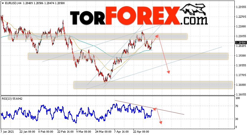 Таким образом, EUR/USD прогноз Евро Доллар на 7 мая 2021 предполагает развитие коррекции и тест области сопротивления вблизи уровня 1.2105. Откуда стоит ожидать отскок и попытку продолжения падения пары в область ниже уровня 1.1775. В пользу падения валютной пары выступит тест линии тренда на индикаторе относительной силы. Отменой варианта снижения пары EUR/USD станет сильный рост котировок и пробой уровня 1.2175. Это укажет на пробой области сопротивления и продолжение подъёма валютной пары на Форекс в область выше уровня 1.2345.
