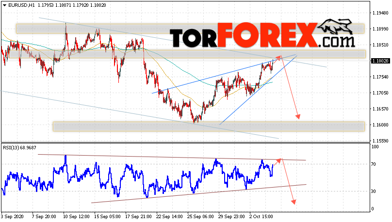 Таким образом, EUR/USD прогноз Евро Доллар на 7 октября 2020 предполагает развитие коррекции и тест области сопротивления вблизи уровня 1.1835. Откуда стоит ожидать отскок и попытку продолжения падения пары в область ниже уровня 1.1605. В пользу снижения валютной пары выступит тест линии тренда на индикаторе относительной силы. Отменой варианта падения EUR/USD станет сильный рост и пробой уровня 1.1865. Это укажет на пробой сопротивления и продолжение подъёма валютной пары на Форекс в область выше уровня 1.2105.