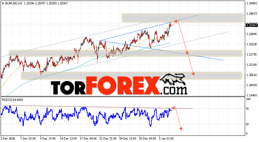 Таким образом, EUR/USD прогноз Евро Доллар на 7 января 2021 предполагает развитие коррекции и тест области сопротивления вблизи уровня 1.2375. Откуда стоит ожидать отскок и попытку продолжения падения пары в область ниже уровня 1.2175. В пользу снижения валютной пары выступит тест линии тренда на индикаторе относительной силы. Отменой варианта падения пары EUR/USD станет сильный рост котировок и пробой уровня 1.2405. Это укажет на пробой области сопротивления и продолжение подъёма валютной пары на Форекс в область выше уровня 1.2615.